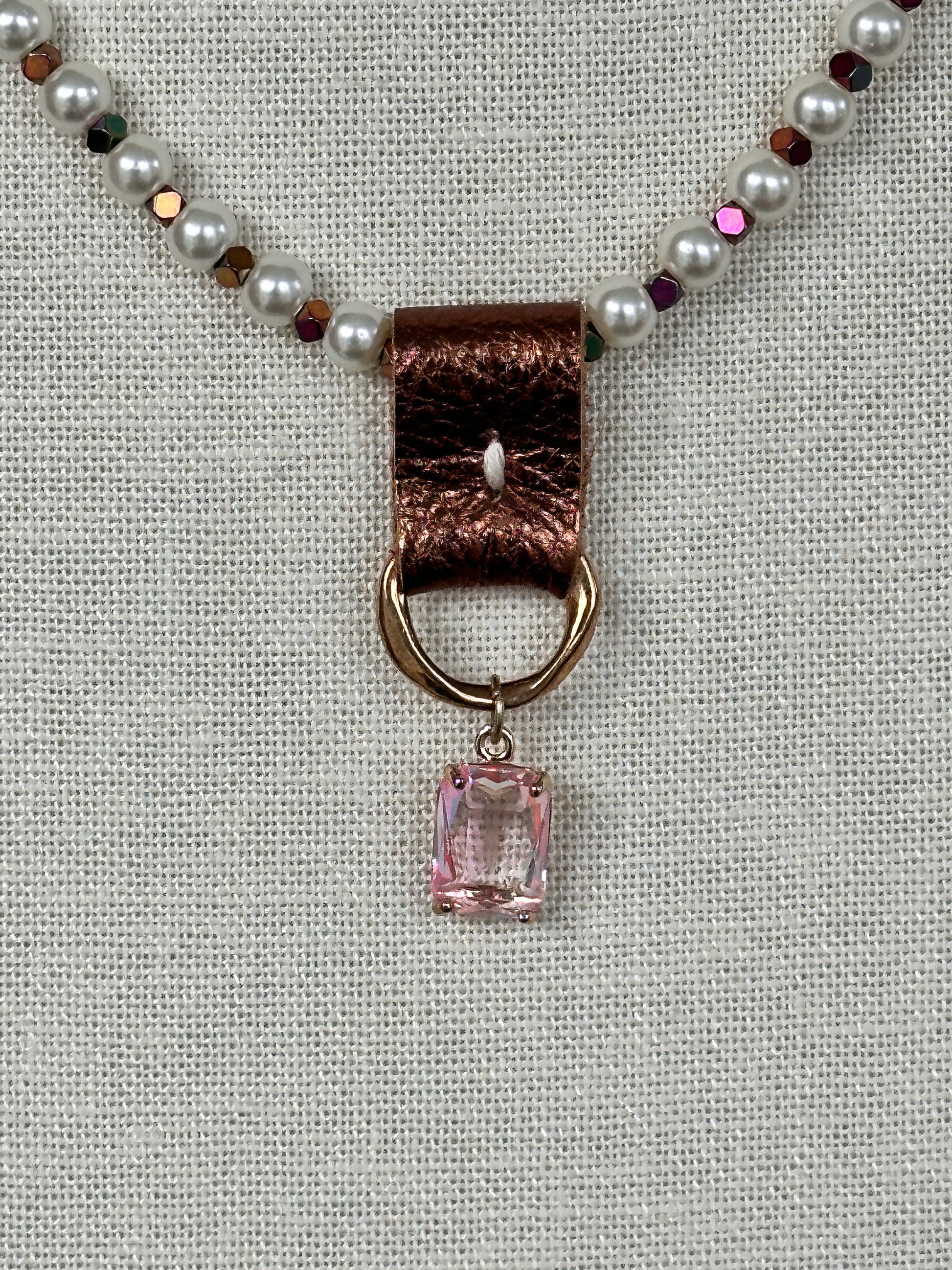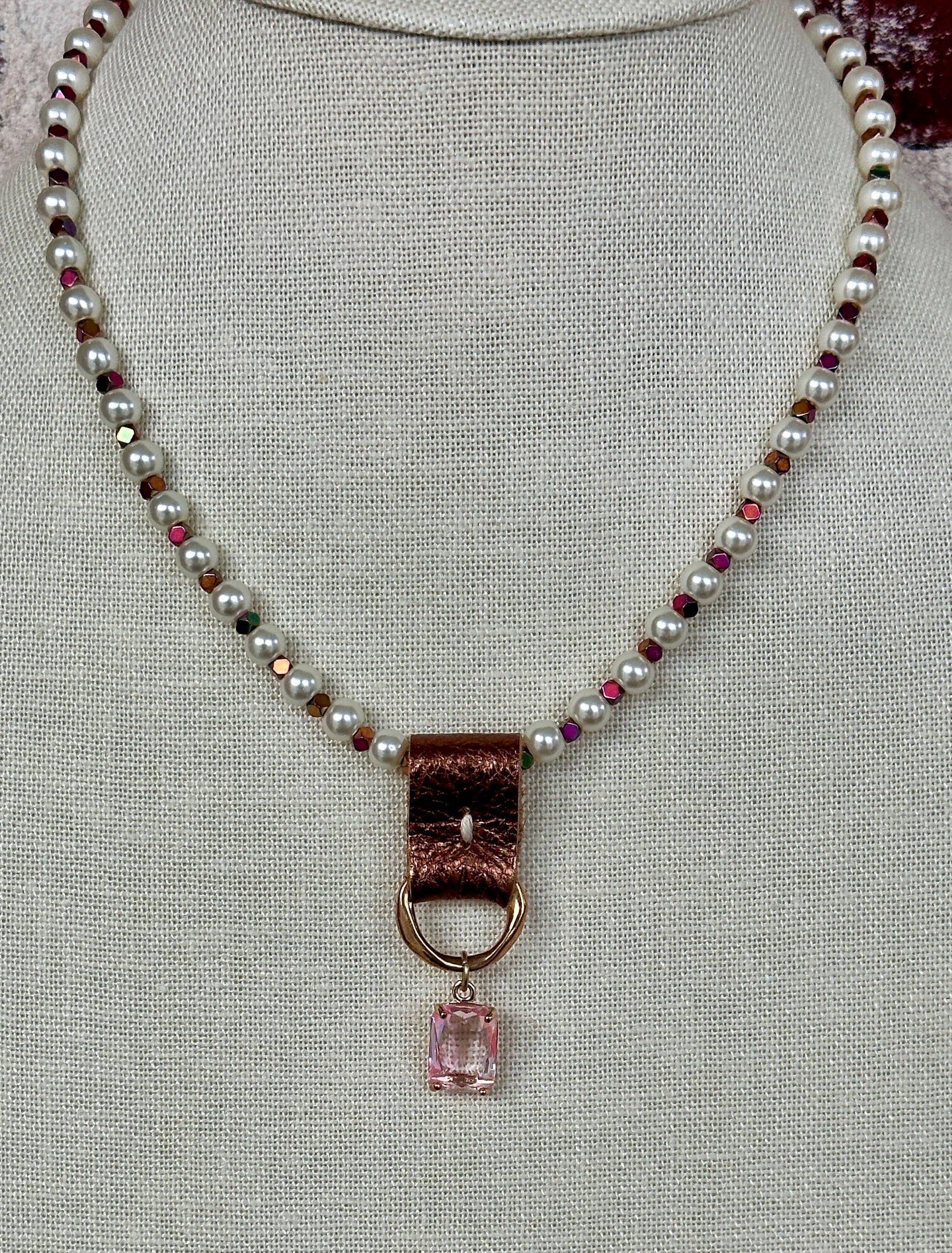 A unique blend of textures and shine—this necklace features 6mm glass pearls paired with multicolor hematite for a subtle shimmer. A strip of brown metallic leather anchors a faceted blush-pink glass pendant, creating a bold yet feminine statement piece. Perfect for adding an artisanal touch to any outfit.