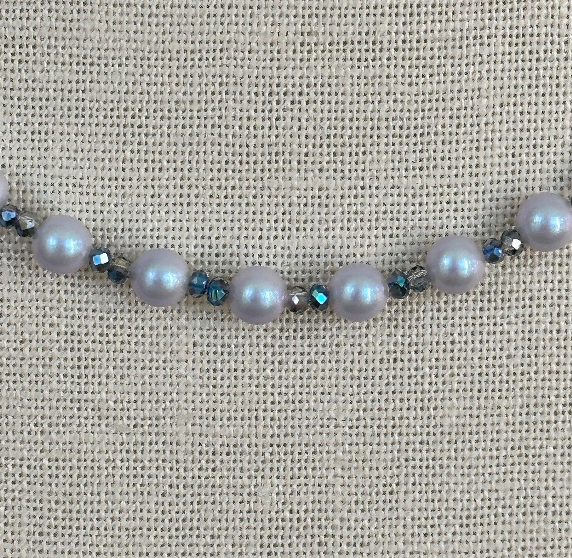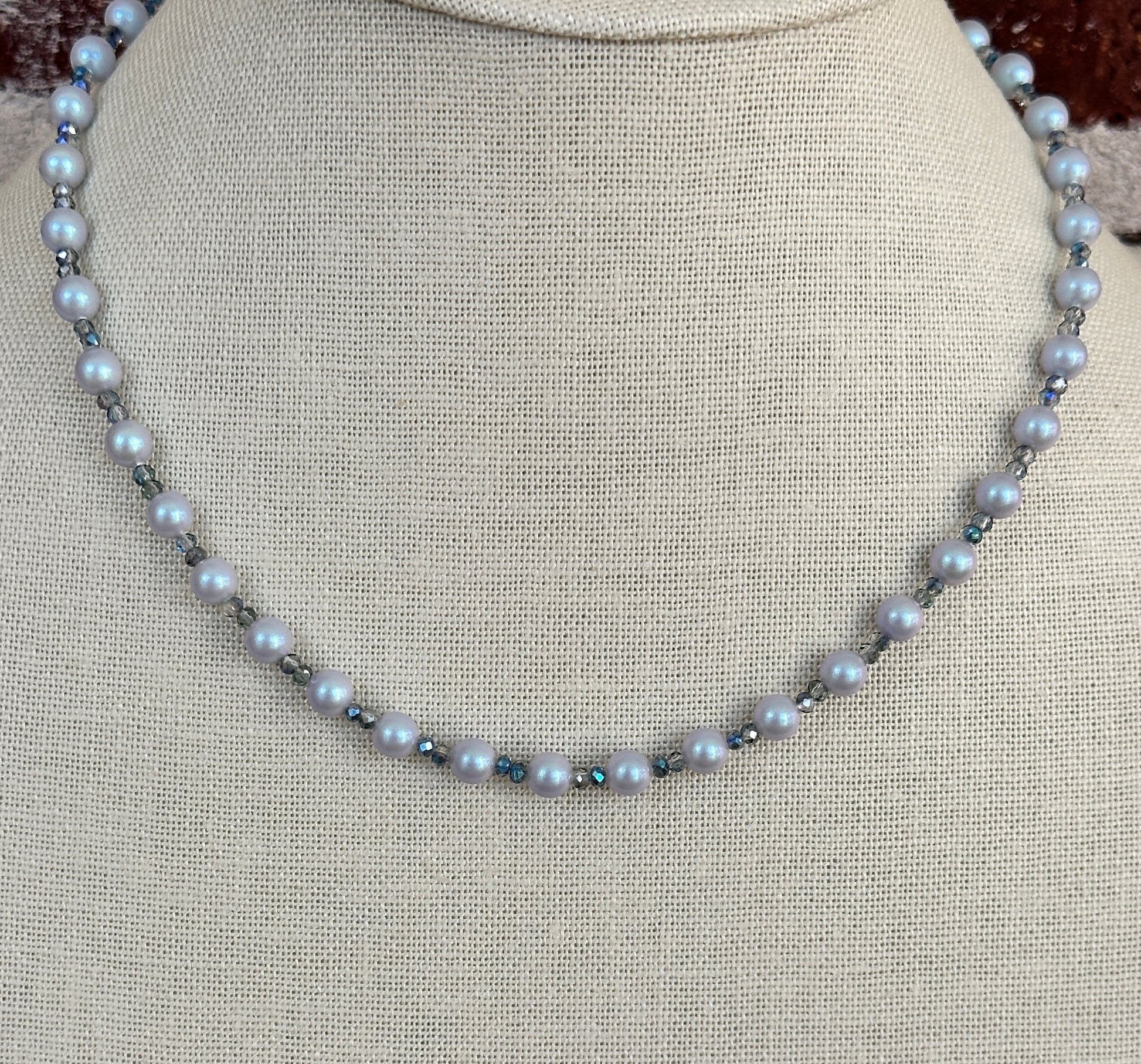 A delicate strand of 6mm iridescent blue glass pearls accented with light blue crystals for a cool, shimmering finish. Soft, elegant, and versatile—perfect for adding a hint of frosty sparkle to any look.