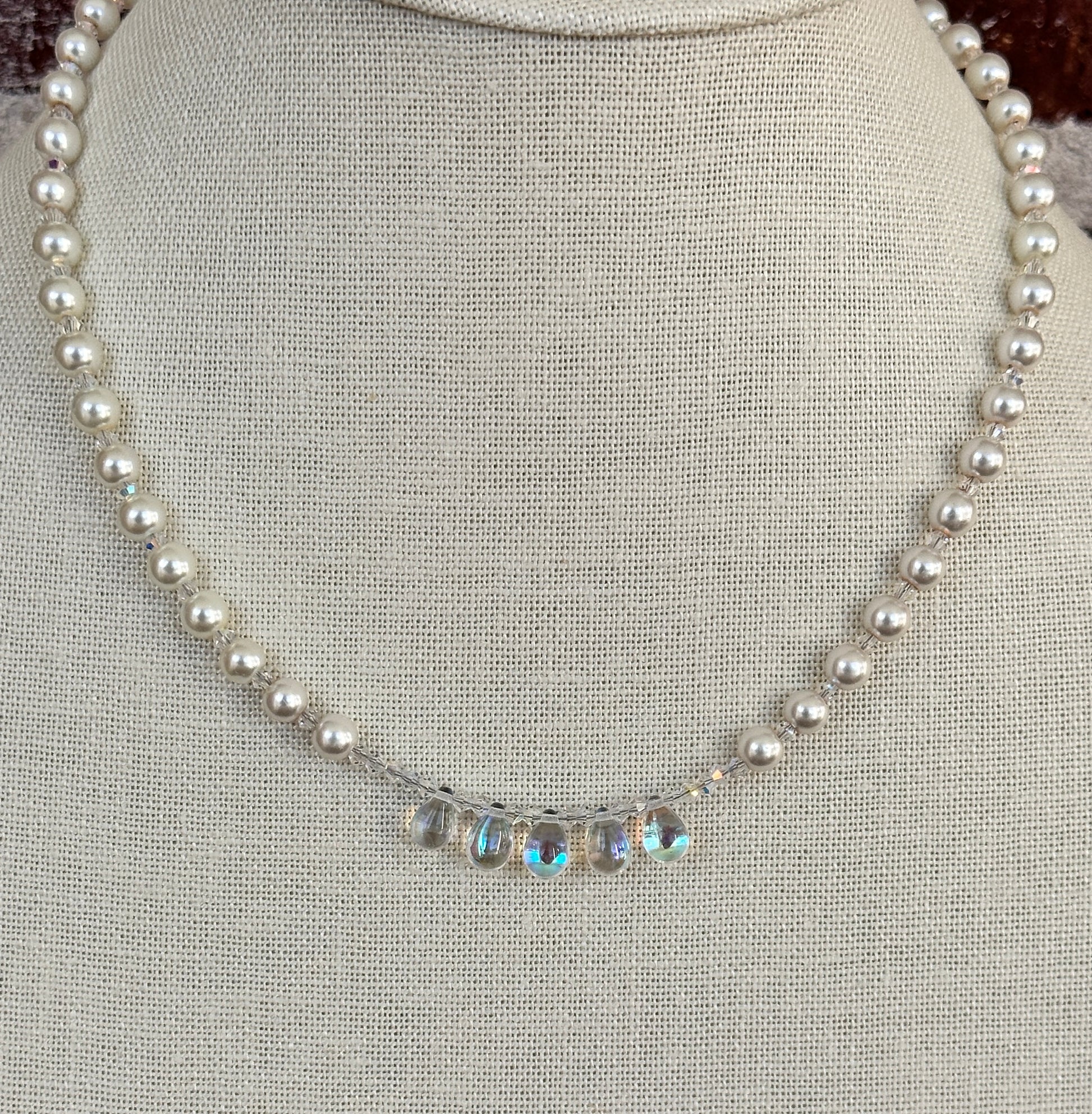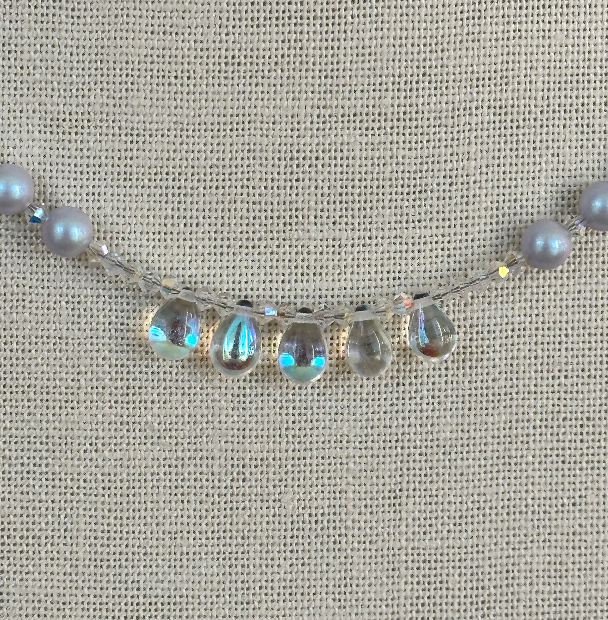 A shimmering strand of 4.5mm iridescent glass pearls accented with sparkling crystals, finished with a row of radiant iridescent glass focal drops that catch the light from every angle. A delicate, luminous piece that adds effortless sparkle to any outfit.