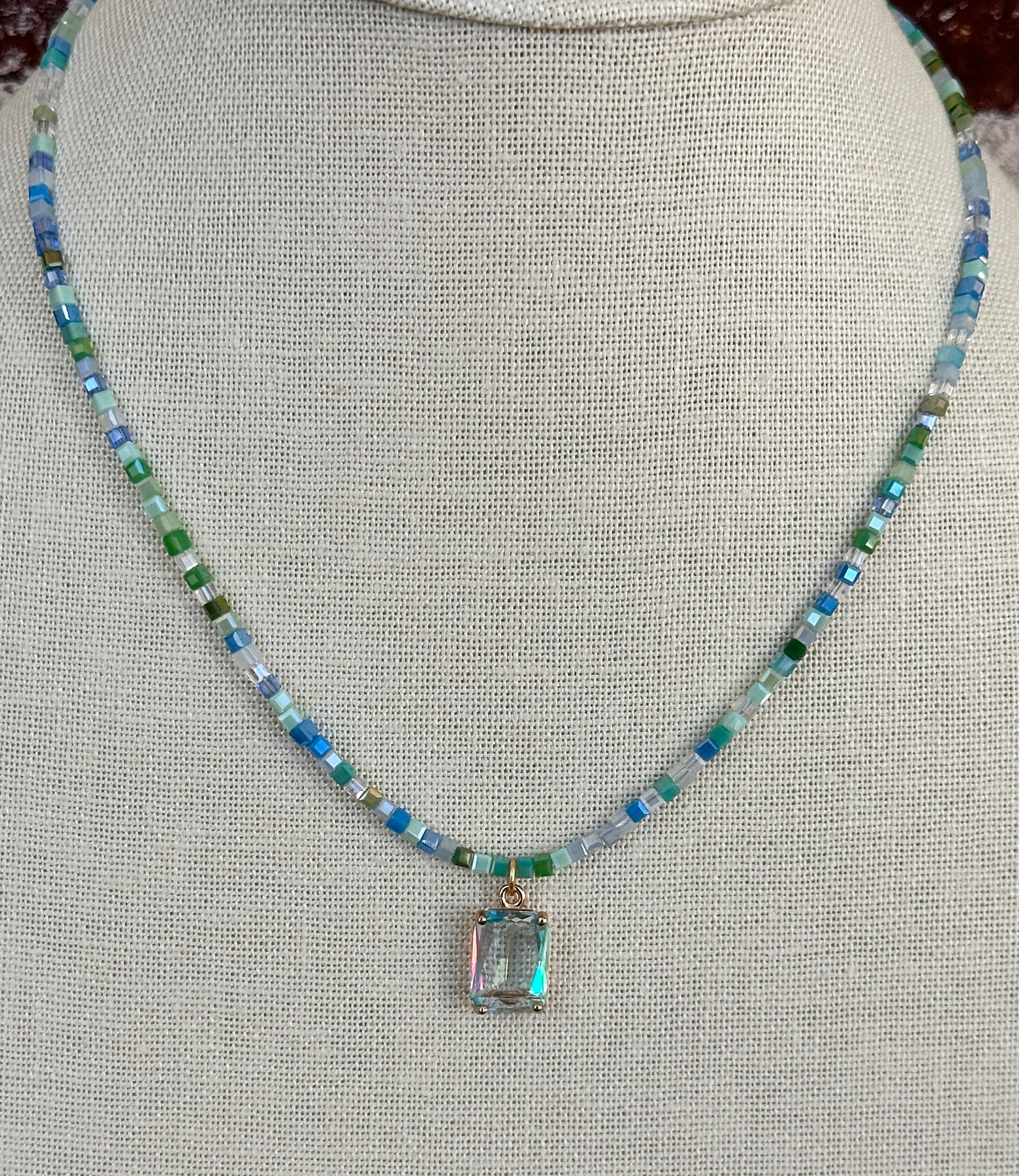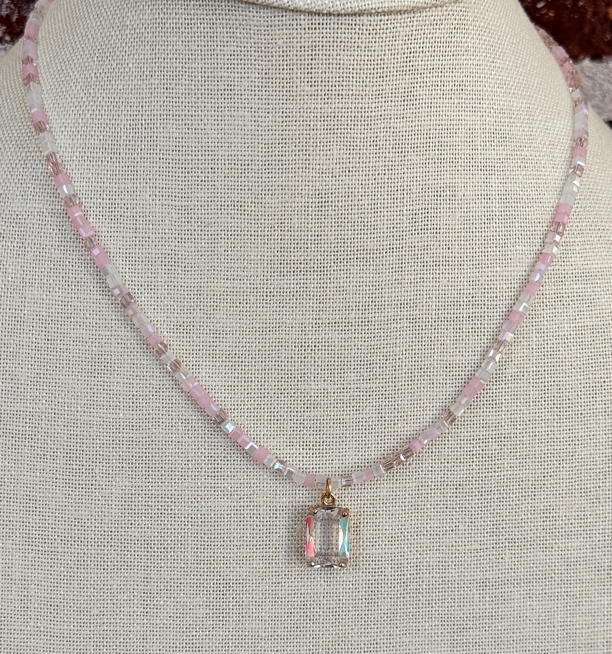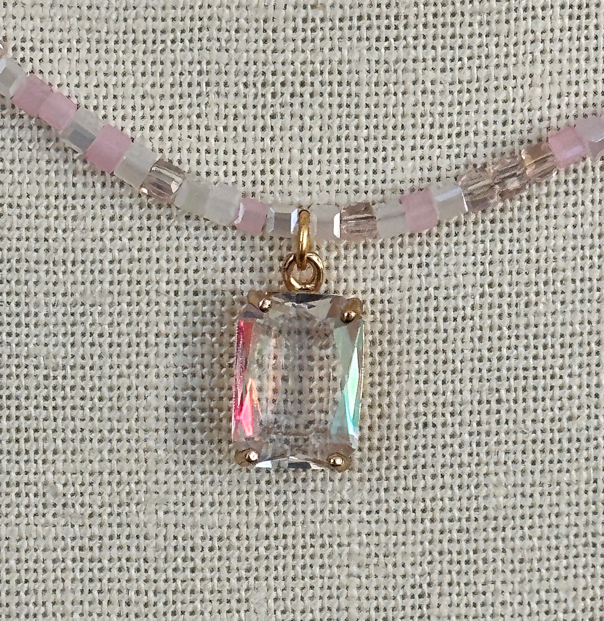 A delicate strand of 2mm glass beads leads to a sparkling emerald-cut crystal pendant that flashes with soft, luminous color. Lightweight and elegant, this necklace adds a subtle shimmer perfect for layering or wearing on its own.