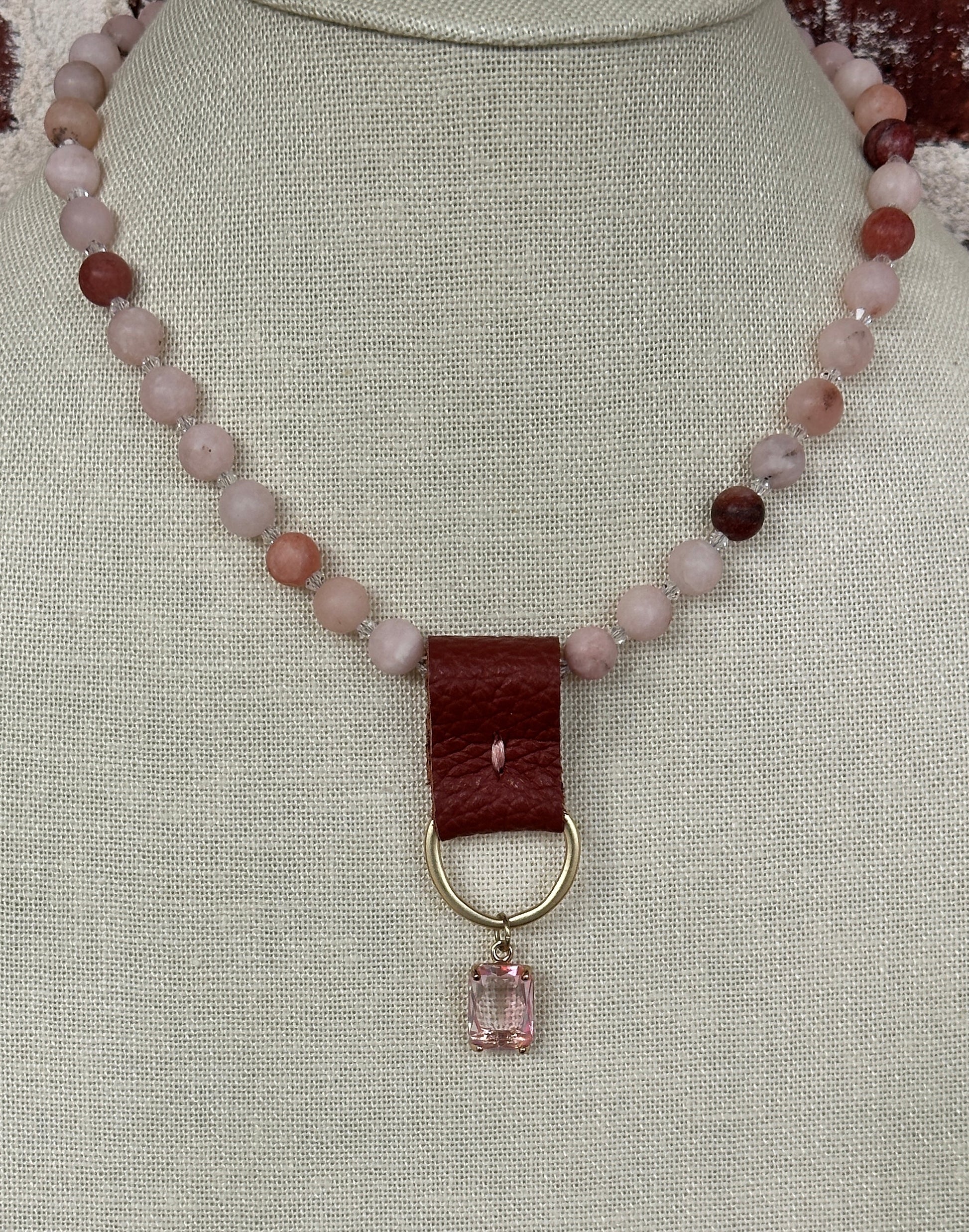 Soft pink 8mm howlite beads paired with a sparkling crystal accent, a hand-sewn leather drop, a goldstone ring, and an emerald-cut glass pendant create a warm, feminine statement with an artisanal edge.