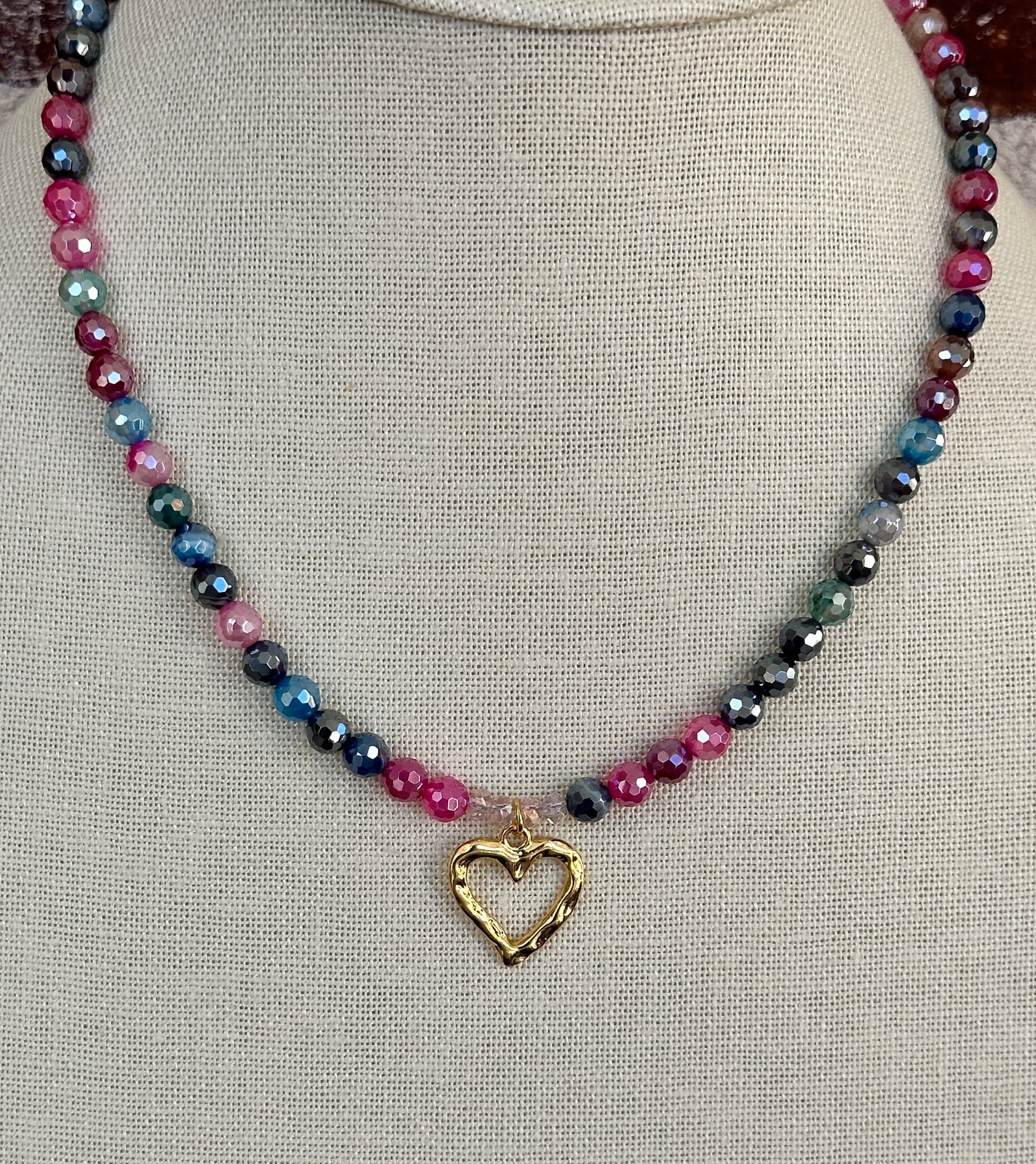 A vibrant mix of multicolor 6mm dyed agate and sparkling crystals creates a playful, eye-catching strand, finished with a gold-tone open heart pendant. A colorful, happy piece that adds a touch of shine to any look.